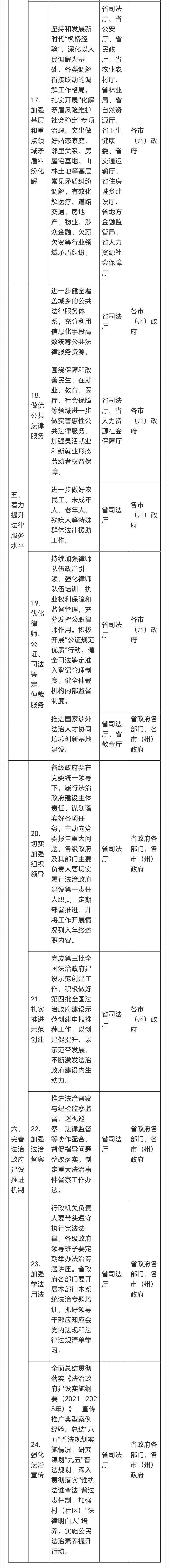 二、强化责任落实。要认真对照工作要点明确的6个方面24项具体任务,进一步压实责任,狠抓落实,并在年度法治政府建设情况报告中体现24项任务完成情况。省司法厅要认真履行牵头职能,加强统筹调度指导,推动各项工作落地落实。